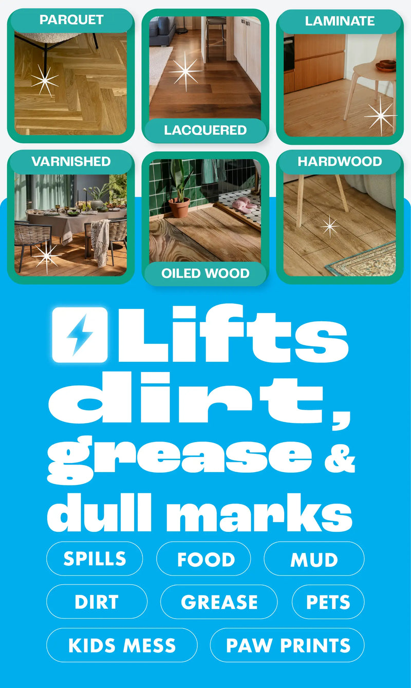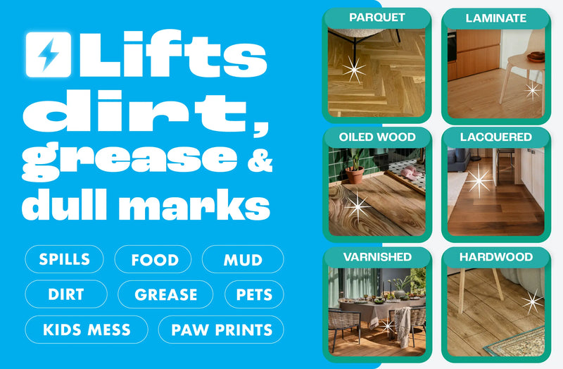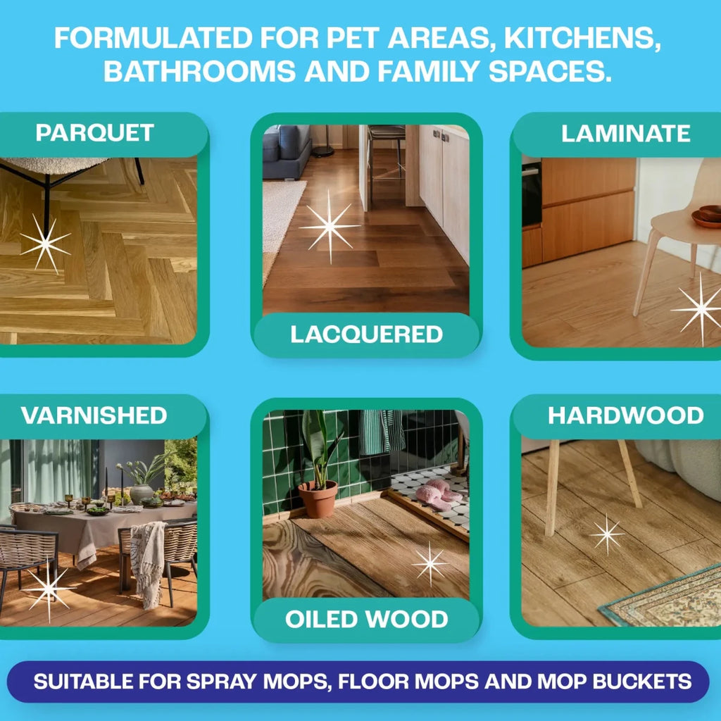 Professional Wood Floor Cleaner: Concentrated wooden, hardwood, parquet and engineered floor cleaner liquid that lifts dirt, grease and dull marks while caring for sealed finishes.